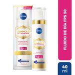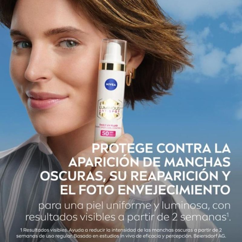 El Fluido facial antimanchas de día NIVEA LUMINOUS630 con FPS 50 es una fórmula ligera y extra protectora que reduce visiblemente las manchas oscuras después de solo 2 semanas. Su composición incluye el ingrediente patentado LUMINOUS630, desarrollado tras 10 años de investigación, que actúa a nivel celular para reducir y prevenir la reaparición de las manchas. Además, está enriquecida con el doble de concentración de Vitamina E*, Ácido Hialurónico activador celular** y filtros UVA/UVB para proteger la piel del sol y el fotoenvejecimiento. Resultados comprobados: la piel se siente hidratada, matificada, más suave, con una textura mejorada, y un tono más parejo y luminoso. Probada para todo tipo de pieles.
