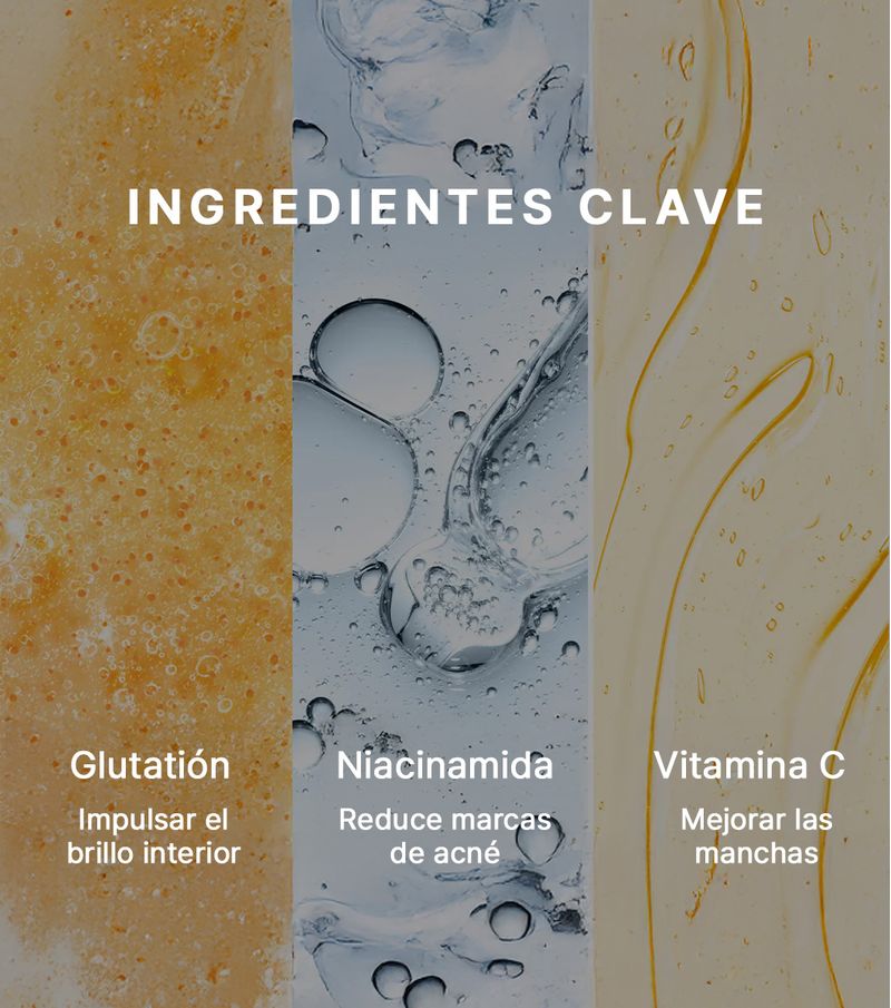 Este serum corrector de manchas ofrece resultados visibles en solo 3 días gracias a su potente combinación de 5% de Glutatión vehiculizado en exosomas, 5% de Niacinamida (Vitamina B3) y 5% de Vitamina C, atenuando manchas oscuras, puntos negros, marcas del acne, tono desigual e hiperpigmentación, para una piel más radiante. Su fórmula hipoalergenica, libre de fragancias, ligera y de rápida absorción, hidrata profundamente y repara la barrera cutánea, dejando la piel jugosa y suave. Ideal para pieles secas, sensibles y mixtas.