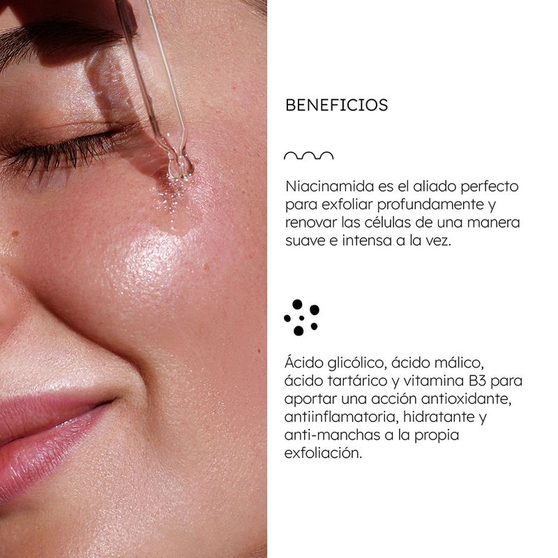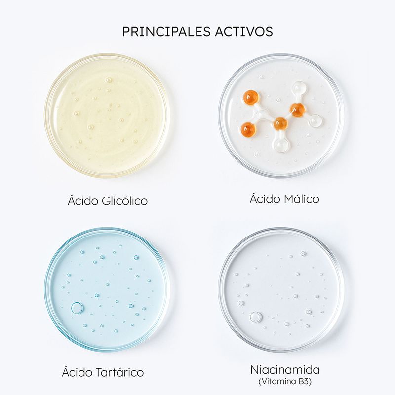 ACTIVOS PRINCIPALES: Ácido Glicólico Ácido Málico Ácido, Tartárico Vitamina B3 Niacinamida