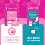Los protectores diarios CAREFREE Protección Compact son ideales para los días previos y posteriores a tu periodo menstrual ya que tiene 5 capas protectoras que sirven para retener flujos menores y mantener tu ropa interior siempre limpia. Además, brindan mayor discreción gracias a su diseño delgado.