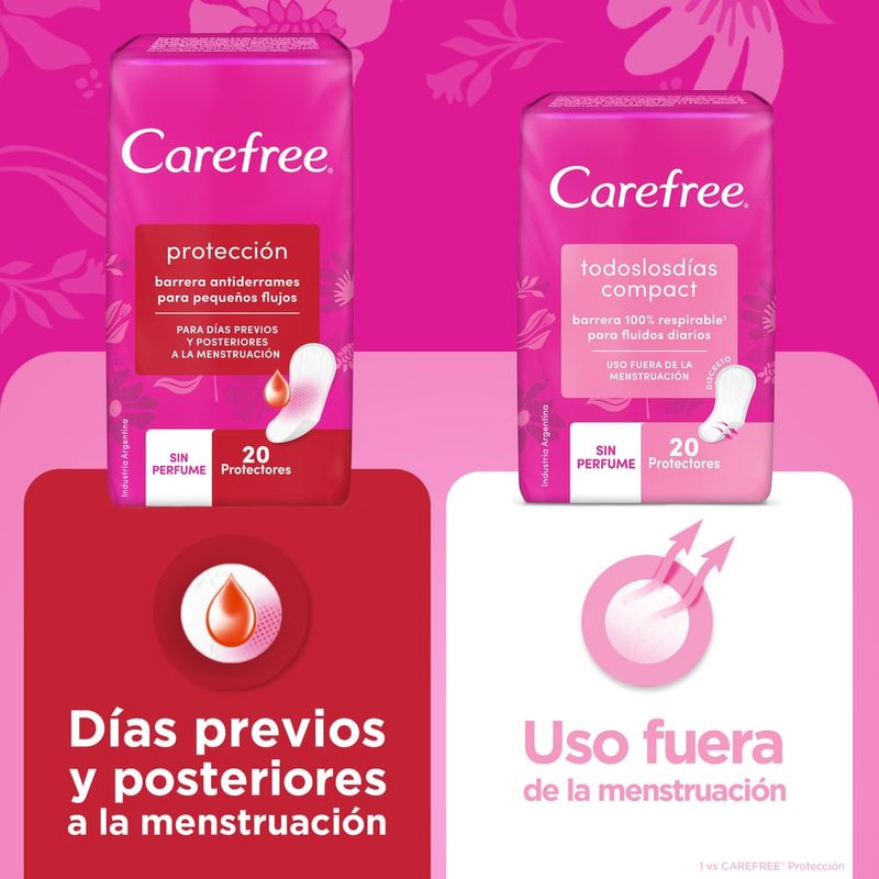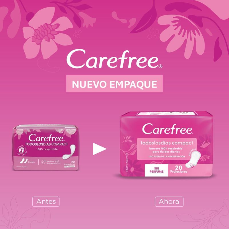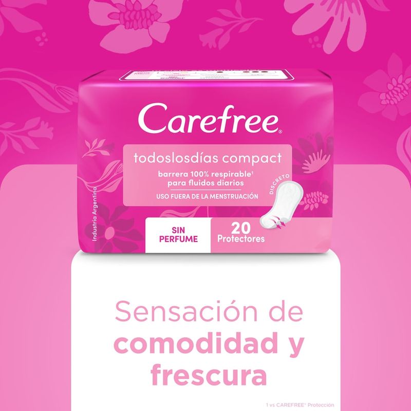 Los protectores diarios CAREFREE® Todos los Días Compact son ideales para ser usados durante los 21 días que no estás en tu periodo menstrual. Tienen una exclusiva tela micro porosa que permite que el aire pase 3 veces más* que con un protector diario convencional y así puedas dejar que tu piel respire naturalmente. Los protectores CAREFREE® Todos los Días Compact están evaluados ginecológicamente para que puedas usarlos diariamente y te sientas limpia, fresca y cómoda todos los días. Además su superficie es delicadamente suave porque está hecho con lo mejor del algodón y no tiene perfume. Contiene neutralizador de olores para que te sientas más segura todo el día, todos los días.