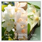 Esta fragancia, cuidadosamente elaborada, combina dulces notas de jazmín, hojas verdes vibrantes, nardo y almizcle.