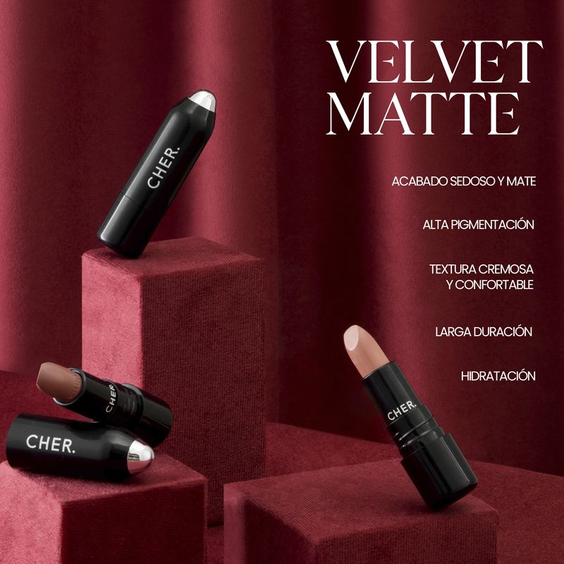 Descubrí nuestro Velvet Matte Lipstick, un labial de larga duración con acabado empolvado y cobertura excepcional. Su fórmula ultra pigmentada y aterciopelada asegura un look mate impecable durante horas, manteniendo tus labios sensuales e intensamente pigmentados, con una hidratación duradera