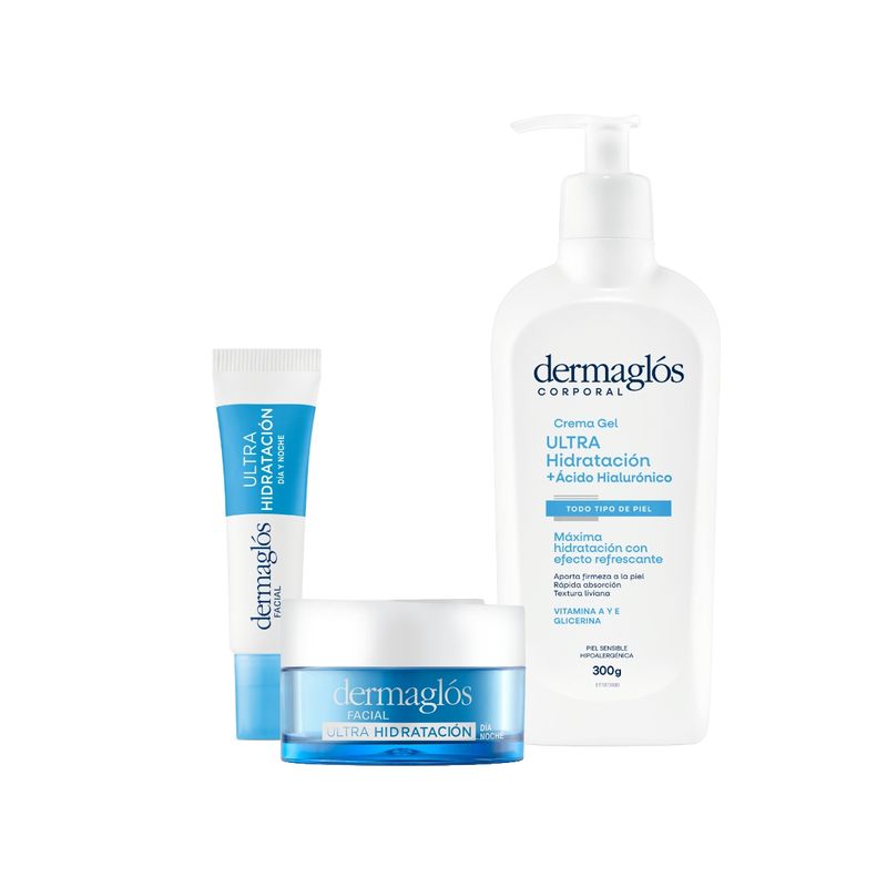 - 1 Crema Gel Ultra Hidratación Con Ácido Hialurónico 300 Gr: brinda máxima hidratación y efecto refrescante. Con textura liviana y de rápida absorción,