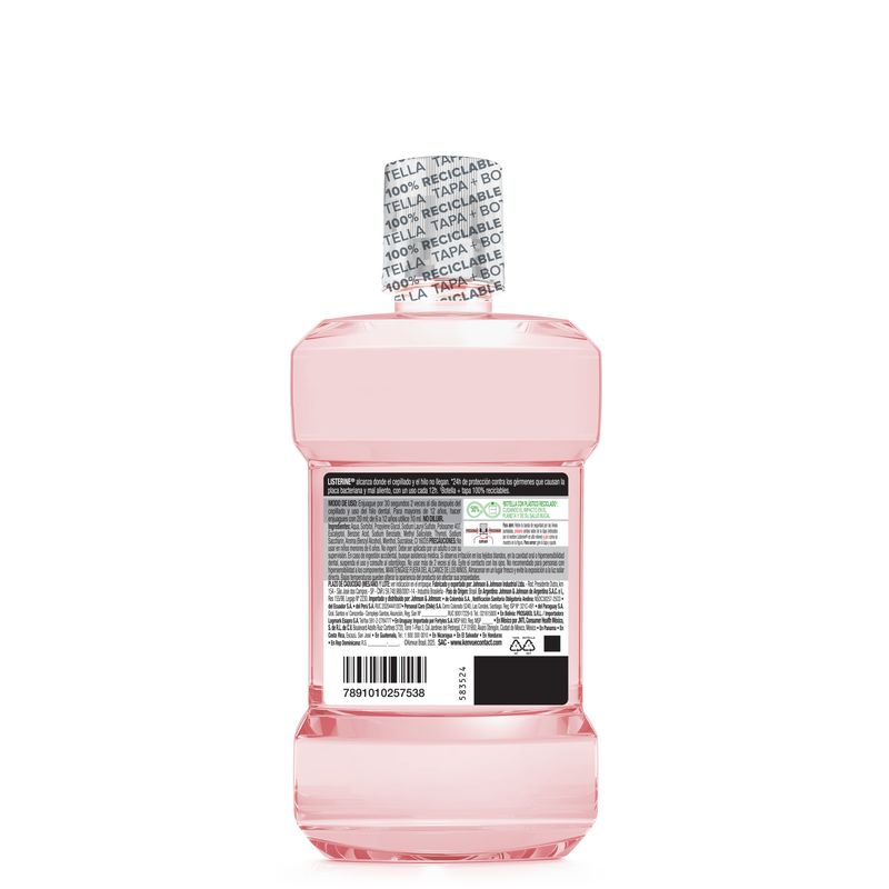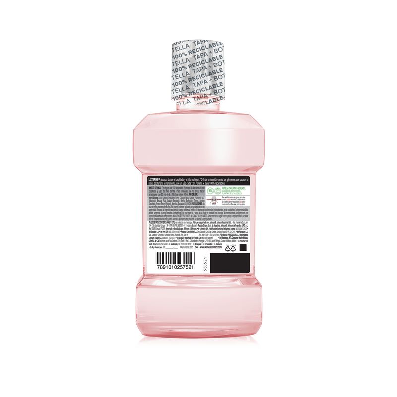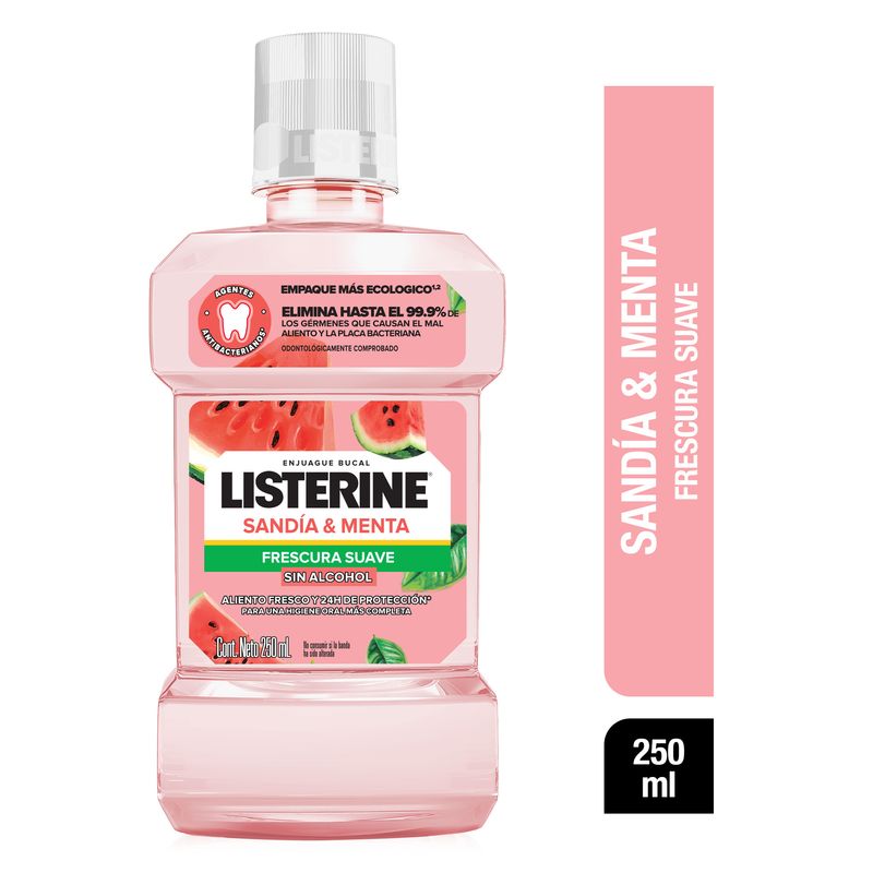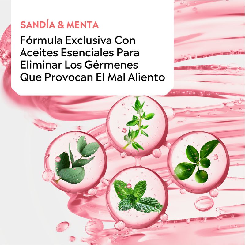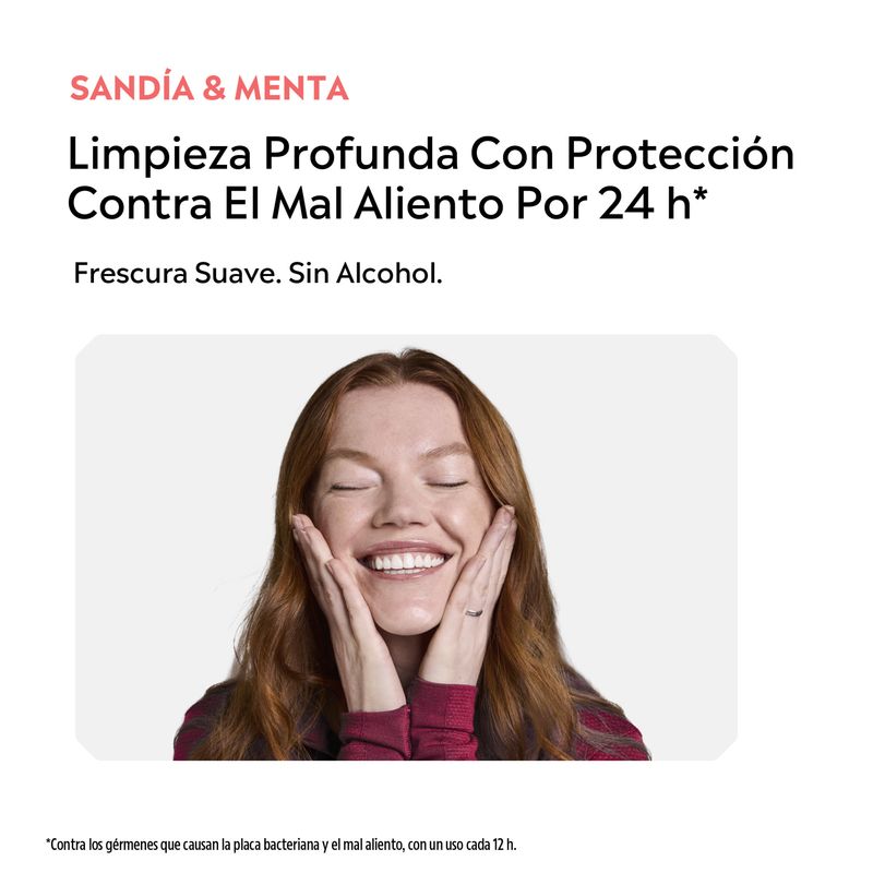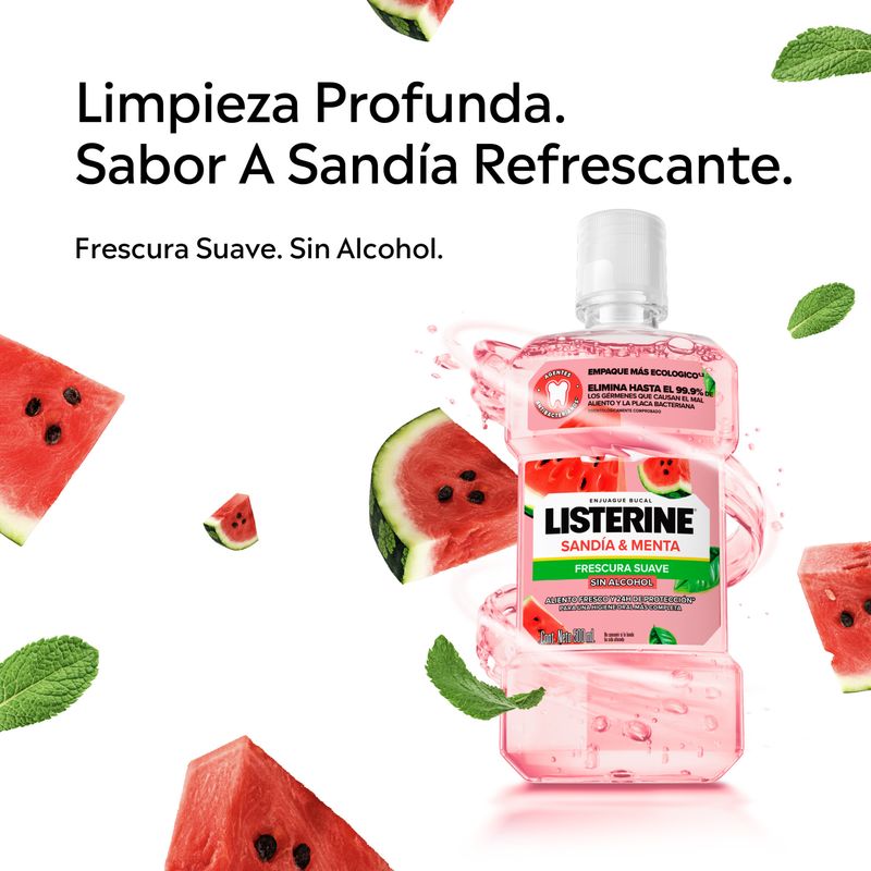 LISTERINE® SANDIA Frescura Suave. Fórmula exclusiva con agentes antibacterianos que eliminan hasta el 99,9% de los gérmenes que causan placa, gingivitis y mal aliento en solo 30 segundos. La innovadora combinación de los cuatro aceites esenciales de LISTERINE® (Timol, Eucaliptol, Mentol y Salicilato de Metilo) actúa sobre las bacterias escondidas en lo más profundo de la boca. Comprobado por Odontólogos