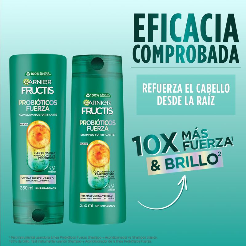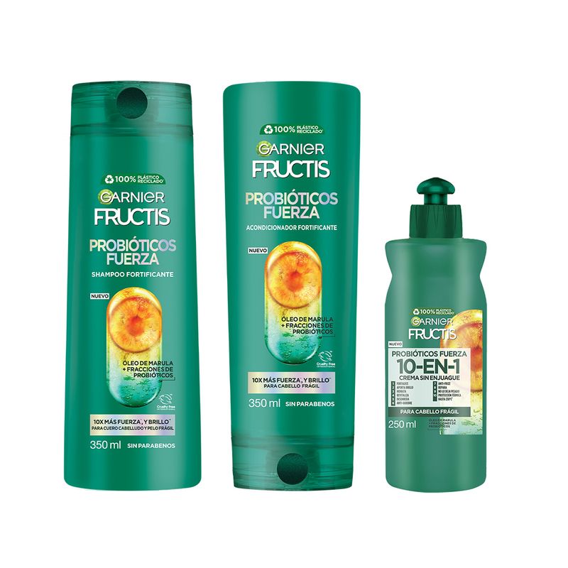 Combo Fructis Probióticos Fuerza para pelo frágil y opaco. Shampoo, acondicionador y crema para peinar que fortalecen y aportan 10 veces más fuerza y brillo. Con óleo de marula y fracciones de probióticos.