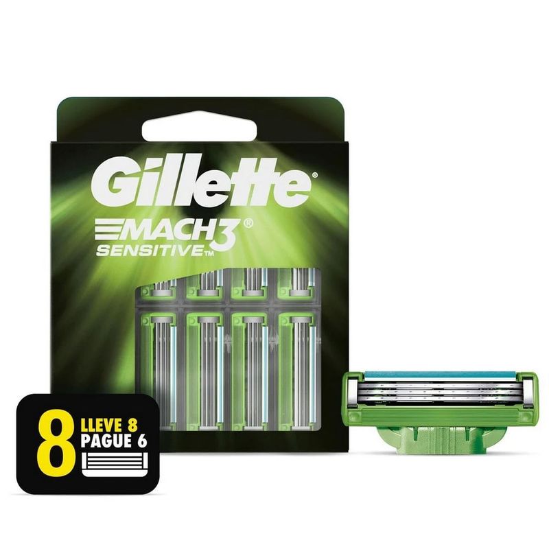 Los repuestos para la máquina de afeitar Gillette Mach3 Sensitive para pieles sensibles cuentan con una banda extra lubricante con Aloe Vera y Vitamina E, que ayuda a proteger tu piel de la irritación.