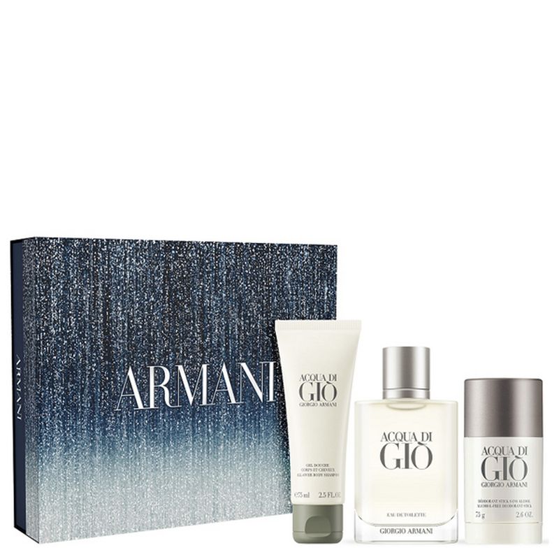 Este elegante set festivo en azul y plata incluye la fragancia Acqua di Giò Eau de Toilette 100 ml, una Mini Talla de 15 ml y un desodorante en barra 75 ml, para una rutina completa de frescor y elegancia masculina.