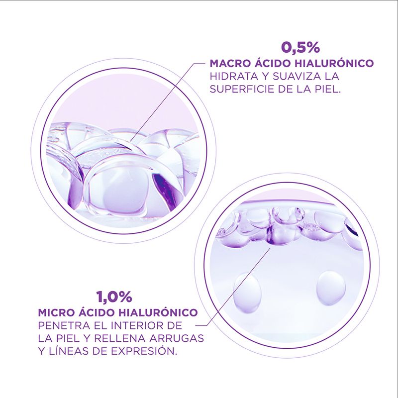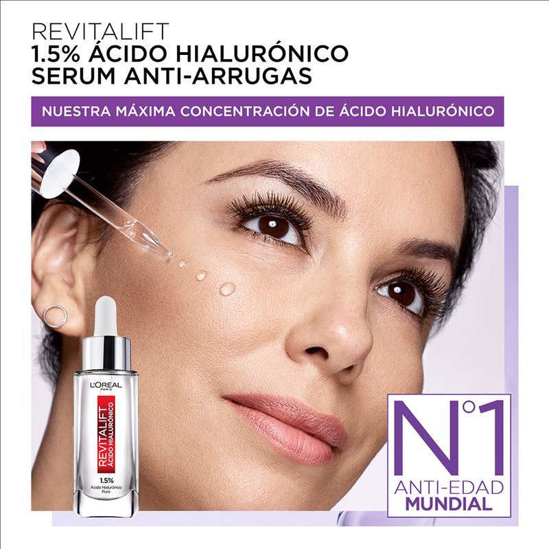 2. El Sérum Revitalift de Ácido Hialurónico de L'Oreal Paris esta formulado con 1,5% de ácido hialurónico ¡La más alta concentración de este activo en un producto cosmético! El sérum está conformado por 2 pesos moleculares. 1% de Micro Ácido Hialurónico capaz de penetrar la piel y rellenar arrugas y líneas de expresión y 0,5% de Macro Ácido Hialurónico capaz de hidratar y suavizar la textura de la piel.
