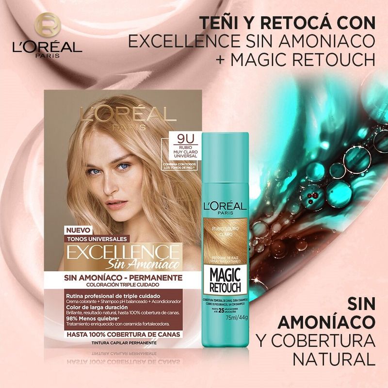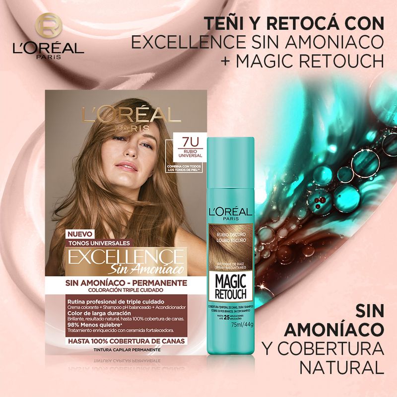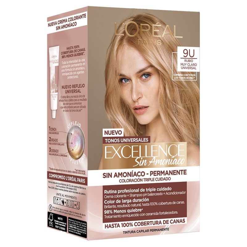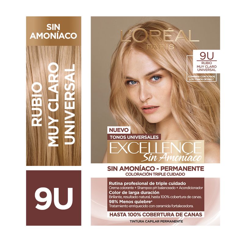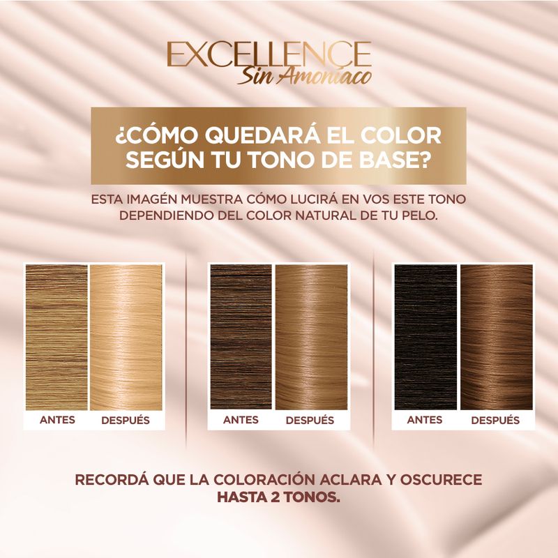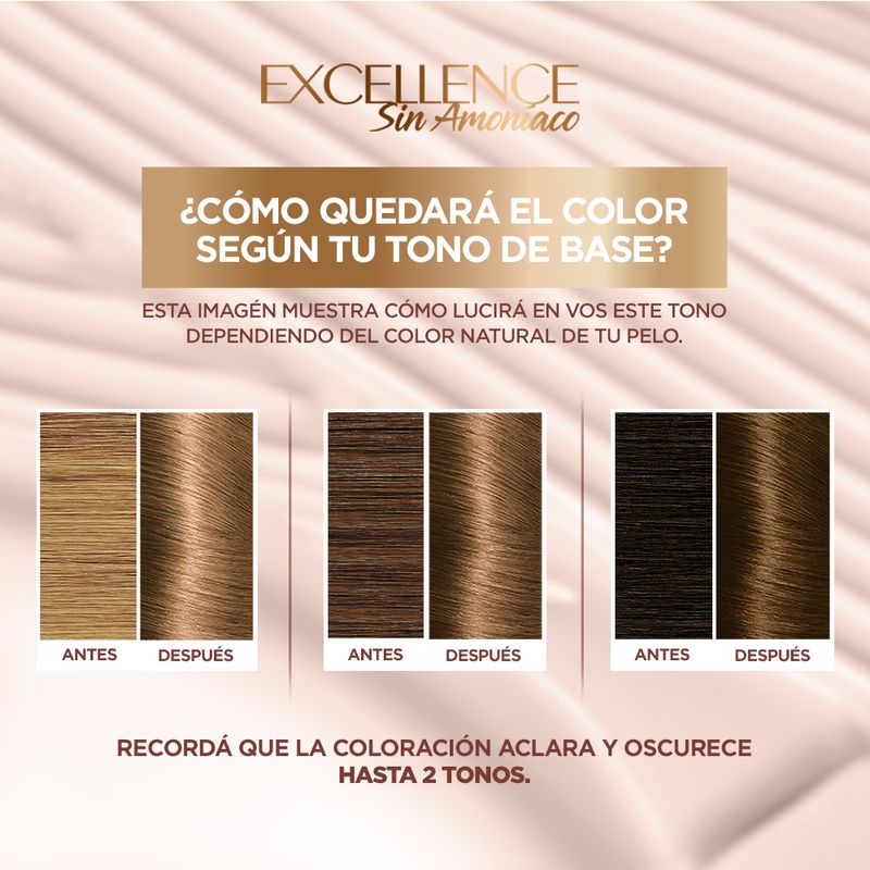 Coloración Permanente en KIT Excellence Sin Amoníaco de L’Oreal París. Excellence Sin Amoníaco Coloración Triple Cuidado Enriquecida con Pro-Keratina, protege tu pelo antes, durante y después de la coloración. Cobertura de 100% de canas, para un color perfecto, radiante y duradero. Nuevo Reflejo Universal. Tonos universales que se adaptan a todo tono de piel. La nueva tecnología de Excellence Sin Amoníaco, hecha con una sola “U” Reflejo Universal, el cuál realza cualquier tipo de piel, dejando un resultado natural. Es el resultado de una combinación de reflejos fríos y cálidos, para obtener un resultado cromático, armonioso y natural. Compuesto por un dorado que nos da luminosidad, un ceniza para neutralizar y un perla para crear un acabado natural. Nuevos Colores Universales. Cada tipo de piel tiene su belleza propia, pero a pesar de eso a veces no es fácil saber que tono es el correcto para vos ante una amplia variedad. Por primera vez, los Laboratorios L'Oréal Paris han formulado un color universal que es adecuado para todas las complexiones de las mujeres”. -Elisabeth BOUHADANA (Directora Global de Comunicación Científica de L'Oréal Paris). Gracias al reflejo U ahora se volverá mucho más fácil elegir tu tono favorito. ¡Si necesitás asesoramiento, nuestro equipo de expertos en coloración puede ayudarte! ¡Asesorate con el Chat de Excellence al + 54 9 11 2789 - 9955 y sacate todas las dudas sobre la coloración en casa! También podes visitar nuestra pagina web: https://www.lorealparis.com.ar/virtual-try-on y probarte los tonos de forma virtual.