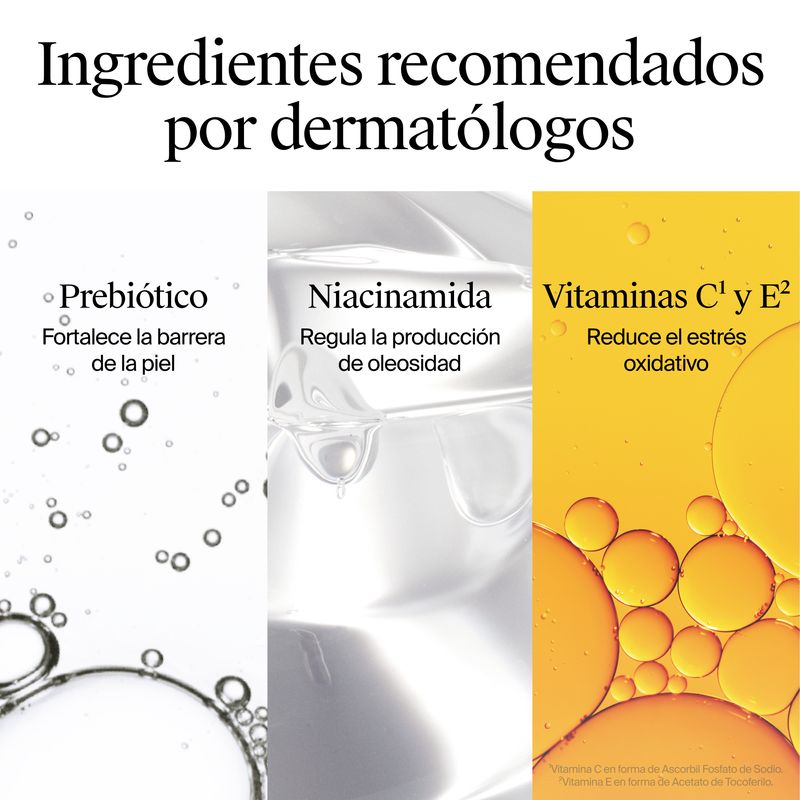 Niacinamida: principio activo que regula la producción de oleosidad; Vitaminas C y E: antioxidantes que reducen el stress oxidativo; Prebiótico: fortalece la barrera de la piel.