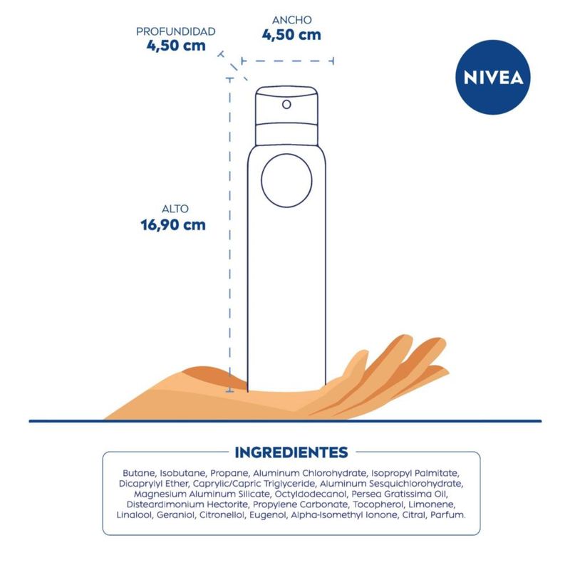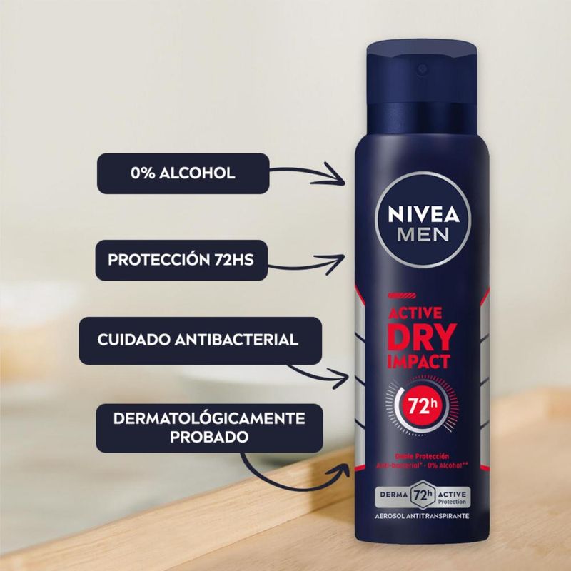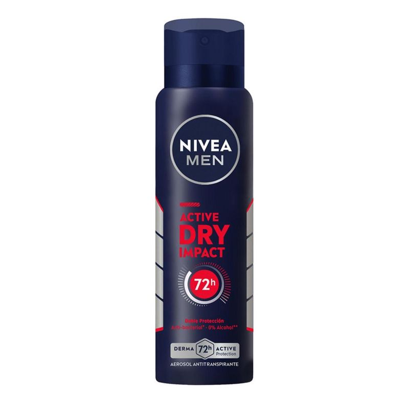El Desodorante antitranspirante NIVEA MEN Dry Impact en aerosol, brinda 72 horas de confiable protección que cuida tu piel. Su fórmula de doble protección, brinda cuidado antibacterial* y 0% alcohol**, para una sensación de piel seca. Está dermatológicamente probado y es adecuado para todo tipo de pieles.