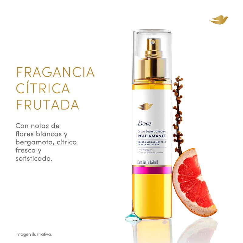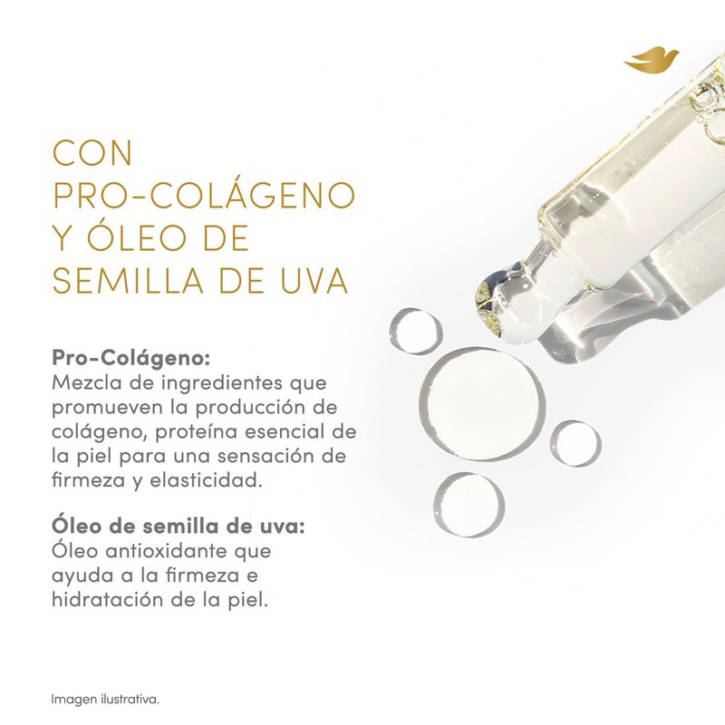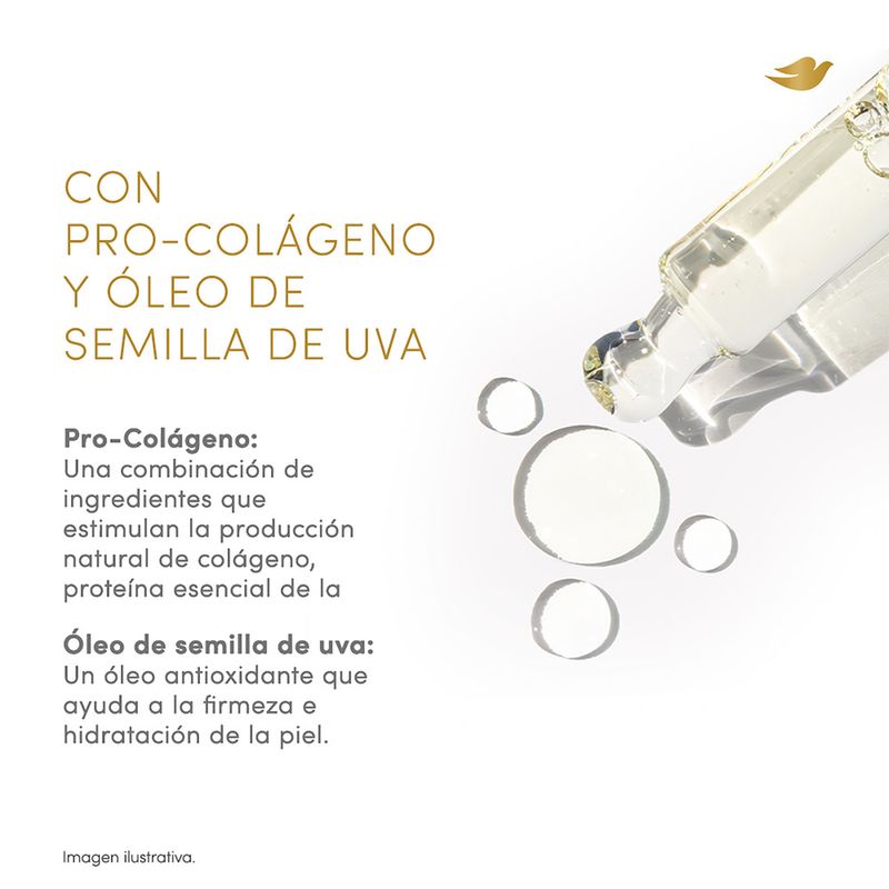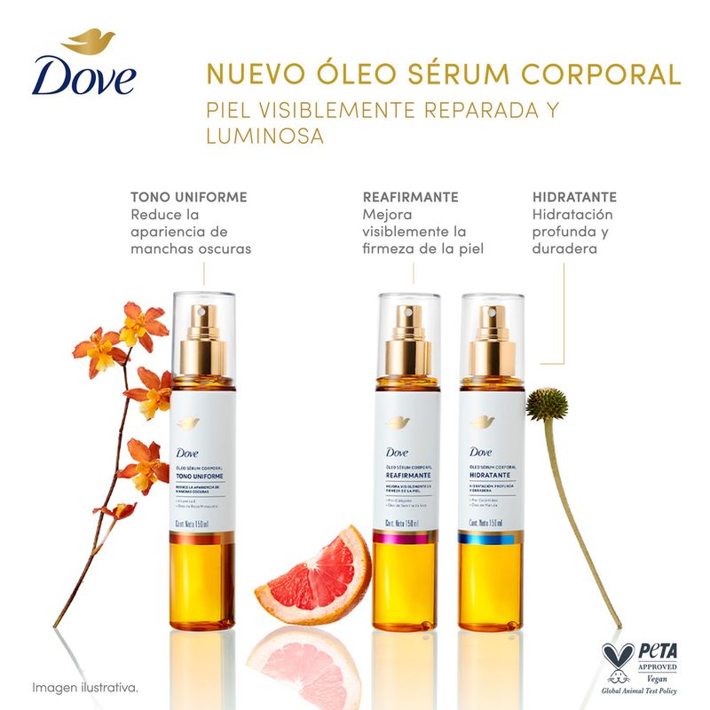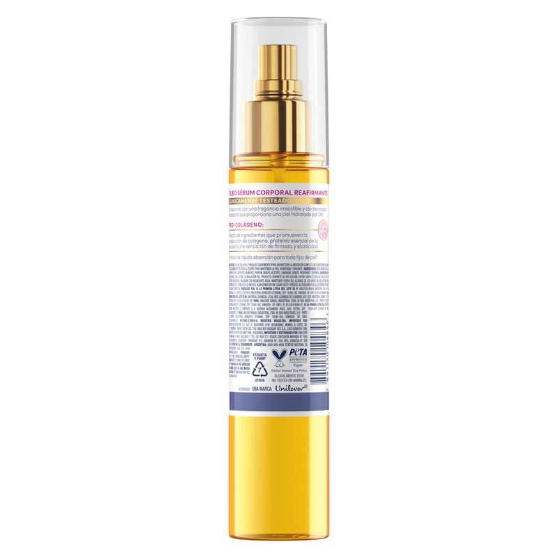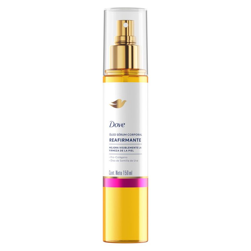 El Nuevo Dove Óleo Sérum Corporal Reafirmante mejora la firmeza y elasticidad de la piel, dejándola luminosa y con una apariencia visiblemente reparada. Su fórmula combina Pro-Colágeno, una mezcla de ingredientes que promueve la producción de colágeno, proteína esencial para una piel con sensación de firmeza y elasticidad, con Óleo de Semilla de Uva, un antioxidante que contribuye a la hidratación y firmeza de la piel. El resultado es una hidratación duradera y un efecto glow inmediato, ideal para quienes buscan una piel más suave e hidratada. Su textura ligera se absorbe rápidamente, sin dejar sensación oleosa*, lo que permite una aplicación cómoda en cualquier momento del día. Clínicamente comprobado, este Óleo Sérum Corporal es apto para todo tipo de piel** y cuenta con una fragancia irresistible que transforma la rutina de cuidado en una experiencia sensorial. Incorporalo a tu rutina diaria y descubrí cómo tu piel puede sentirse más firme, hidratada y luminosa.