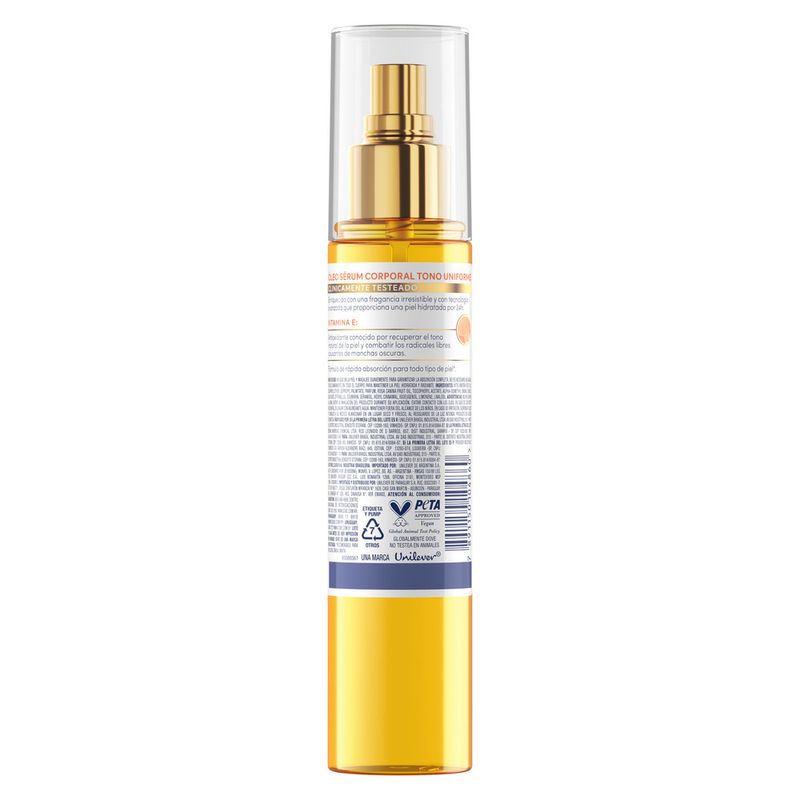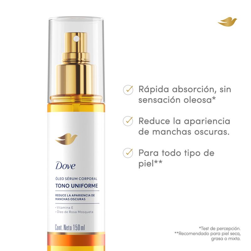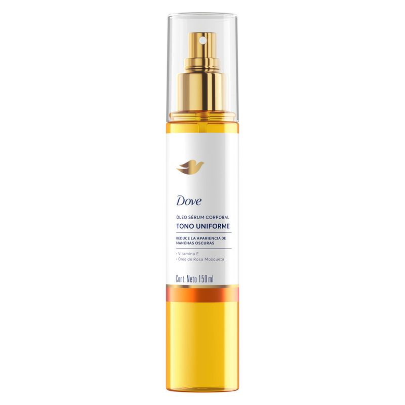 El Nuevo Dove Óleo Sérum Corporal Tono Uniforme ayuda a reducir la apariencia de manchas oscuras, dejando la piel luminosa y con un aspecto visiblemente reparado. Su fórmula combina Vitamina E, un antioxidante conocido por recuperar el tono natural de la piel y combatir los radicales libres causantes de manchas oscuras, con Óleo de Rosa Mosqueta, un óleo 100% natural que ayuda a uniformizar el tono de la piel. El resultado es una hidratación duradera y un efecto glow inmediato, ideal para quienes buscan una piel más suave, hidratada y con tono más uniforme. Su textura ligera se absorbe rápidamente, sin dejar sensación oleosa*, lo que permite una aplicación cómoda en cualquier momento del día. Clínicamente comprobado, este Óleo Sérum Corporal es apto para todo tipo de piel** y cuenta con una fragancia irresistible que transforma la rutina de cuidado en una experiencia sensorial. Incorporalo a tu rutina diaria y descubrí cómo tu piel puede sentirse más hidratada, luminosa y con un tono más uniforme.
