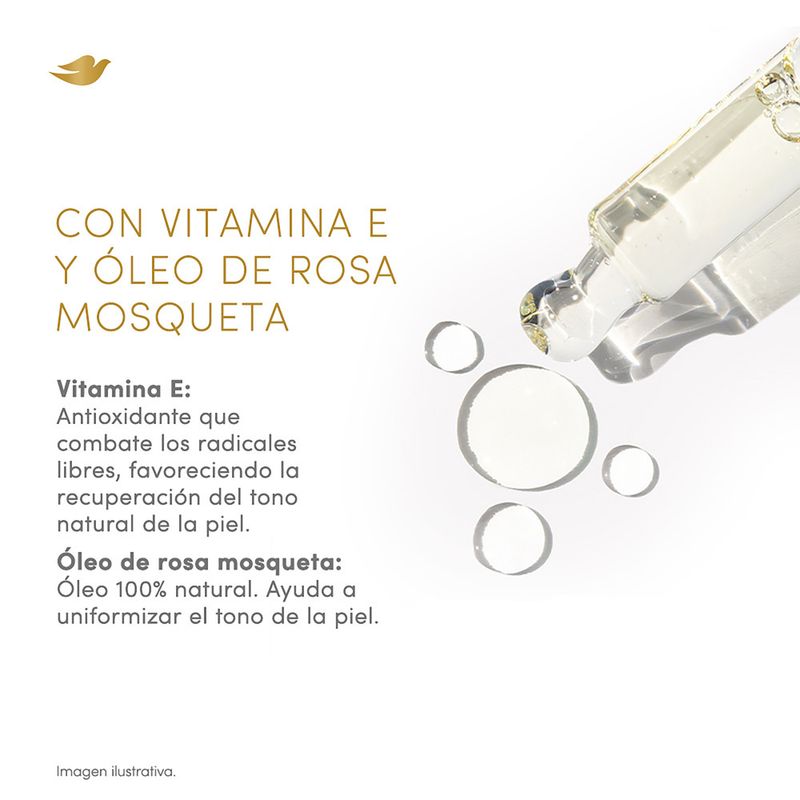 Con Vitamina E y Óleo de Rosa mosqueta, que ayudan a reducir la apariencia de manchas oscuras. Piel hidratada, luminosa y visiblemente reparada. Rápida absorción. Su textura ligera se funde en la piel, sin dejar sensación oleosa*.