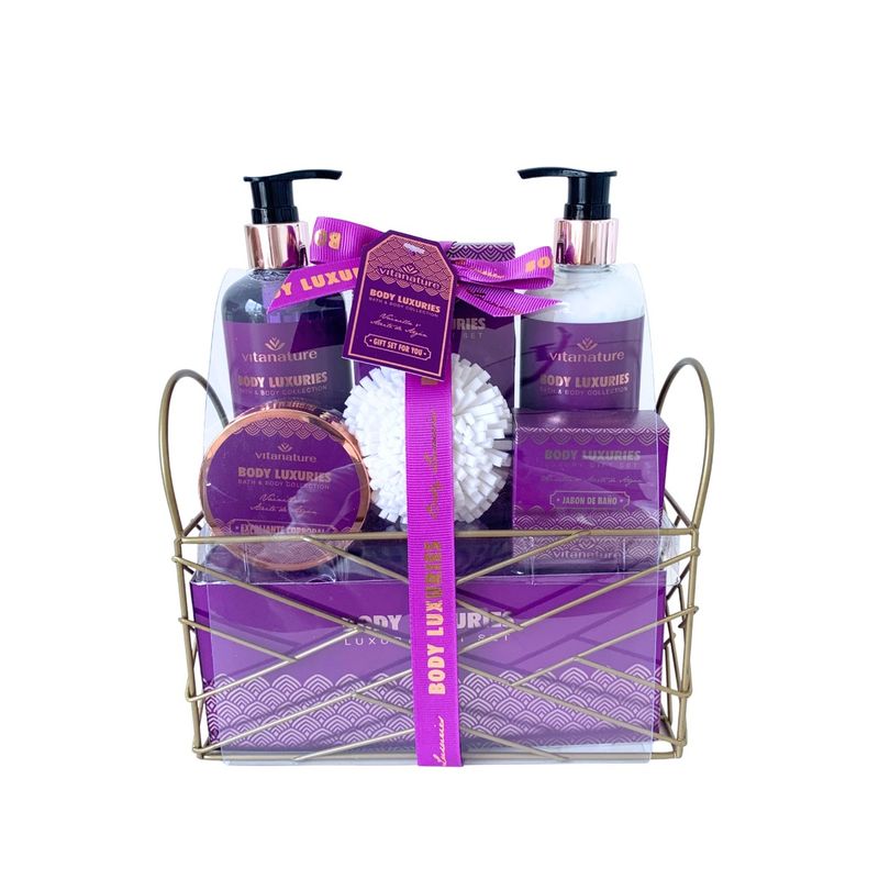 Incluye esponja de baño, jabón exfoliante corporal, sales de baño, loción corporal y gel de baño, todo lo que necesitás para crear tu propio ritual de spa en casa.